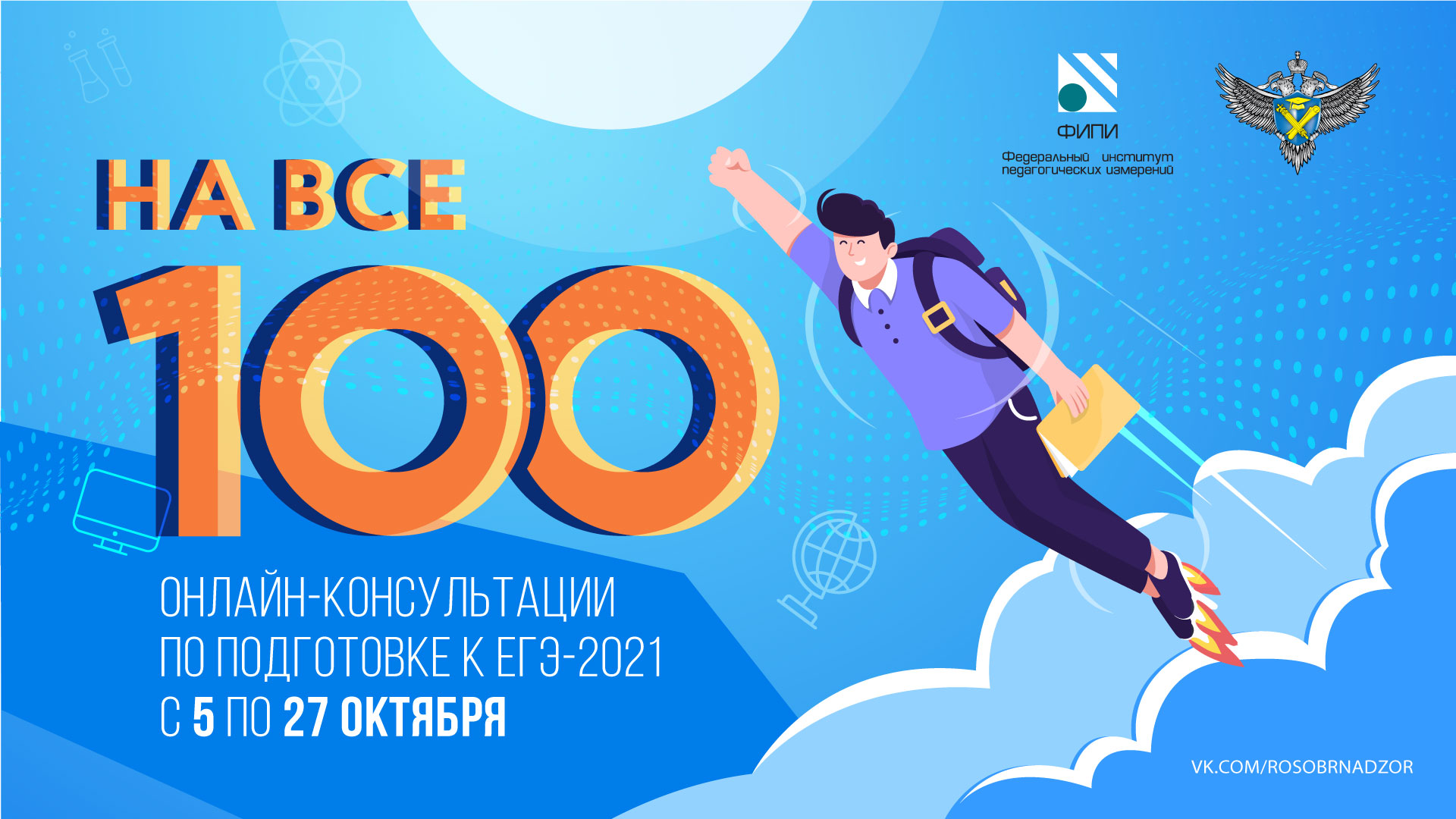 01.10.2020Разработчики контрольных измерительных материалов ЕГЭ из Федерального института педагогических измерений (ФИПИ) в октябре проведут серию онлайн-консультаций «На все 100!» для будущих участников экзаменов.В ходе консультаций все участники ЕГЭ и педагоги смогут в простой и доступной форме получить информацию об экзаменационных материалах ЕГЭ 2021 года: какова структура и содержание экзаменационной работы, какие изменения ждут выпускников в этом учебном году, на какие задания стоит обратить особое внимание и как правильно выстроить работу по подготовке к ЕГЭ, как избежать типичных ошибок и правильно пользоваться доступными ресурсами для подготовки.