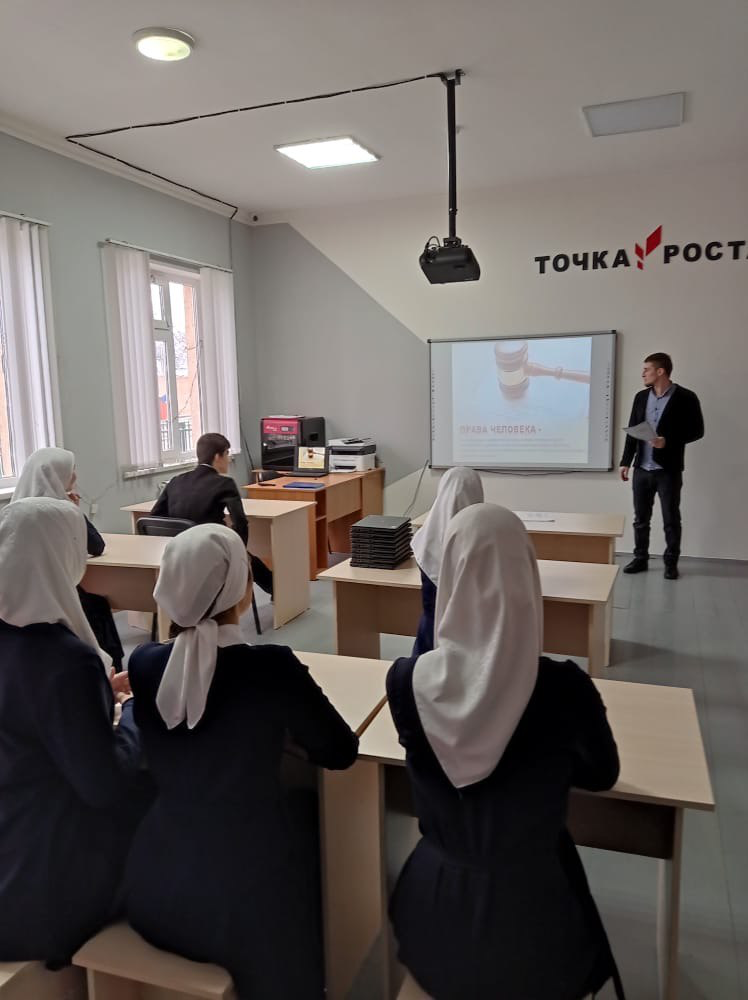 Учитель обществознания Духигов М.М. провел с обучающимися 9 – 10 классов Всероссийский единый урок «Права человека». На данном уроке приняли участие 58 учащихся школы.