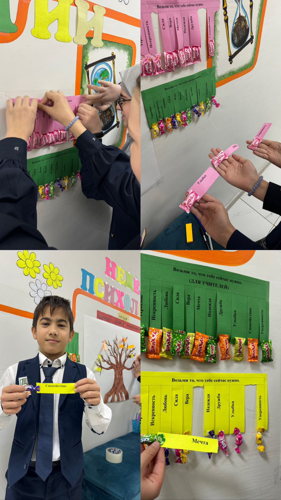 20.11.2024 г прошла акция «Возьми то, что тебе нужно» и выбором, что можно взять: «терпение, искренность, любовь, сила, мечта, надежда, дружба, улыбка, спокойствие, уверенность». Акция оказалась востребована, дети сразу же разобрали, то что им было необходимо.