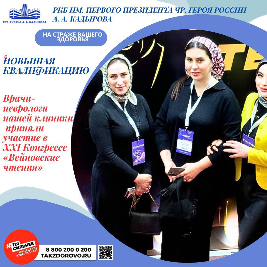 В рамках реализации федерального проекта «Производительность труда» национального проекта «Эффективная и конкурентная экономика», врачи-неврологи РКБ имени А-Х. Кадырова Айдамирова Селита и Абдурашедова Аза, во главе с заведующей отделением неврологии ОНМК Заремой Дидиевой, приняли участие в XXI Междисциплинарном конгрессе с международным участием «Вейновские чтения».